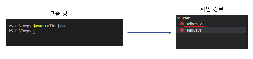 2) 콘솔화면에서 javac '파일이름명.java'를 작성 후 엔터를 누르면 컴파일이 된다. 바이트 파일(.class)가 생긴 것을 확인할 수 있다.