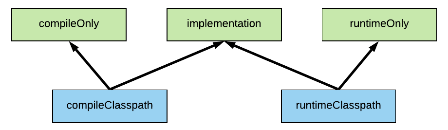 - implementation : 두가지(compile, runtime) classpath 에 추가