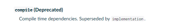 바로 compile 이 deprecated 되었다. 하지만 밑에 설명에서 보다시피 compile은 implemetation이 대체할 수 있다. deprecated된 configuration을 Gradle 7.0 버전 이상부터 사용할 경우 build가 제대로 안될 수 있으니 이 점 기억해야한다.
