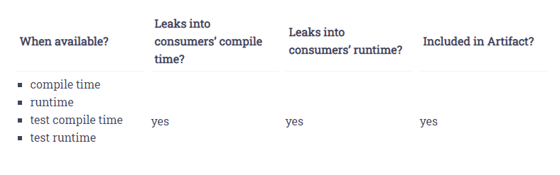 어떤 클래스패스에 해당 dependency가 필요하냐에 따라 달라진다. dependency에 적용할 아래의 세가지 옵션을 확인해보자.