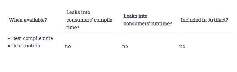 컴파일 시에 의존성이 필요할 수도 있고, 실행 시에만 의존성이 필요할 수도 있다. 또는 테스트 환경에서 의존성이 필요할 수도 있다.